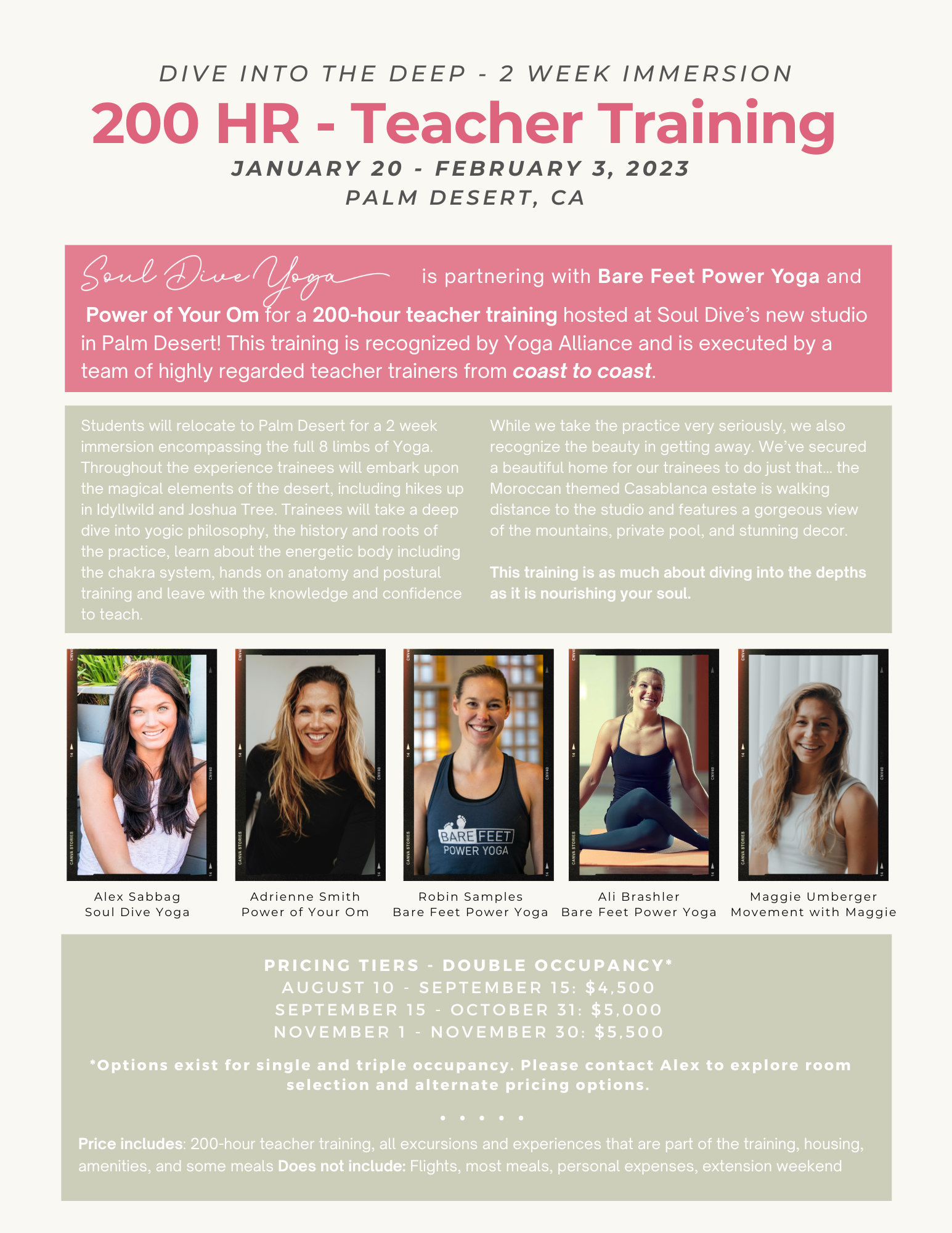 200-Hour Teacher Training - A two-week immersion from January 20th to February 3rd, 2023. Teachers from three different studios are coming together to share their light and help yogis deepen their practice. If you are interested in joining us, please do not hesitate to reach out for more details!